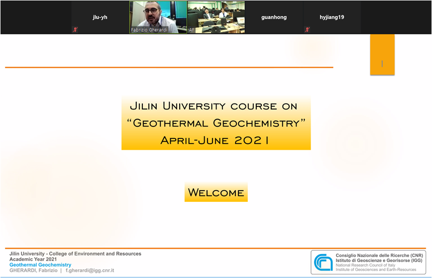 為深化研究生培養(yǎng)模式改革,滿足疫情常態(tài)化情況下課程教學(xué)的客觀需求,加強(qiáng)研究生國際化課程建設(shè),提升研究生課程的教學(xué)水平和教學(xué)質(zhì)量,開拓培養(yǎng)研究生的國際化視野,應(yīng)吉林大學(xué)新能源與環(huán)境學(xué)院許天福教授、馮波教授的邀請,意大利國家研究委員會(CNR)-地球科學(xué)與地球資源研究所(IGG) Fabrizio Gherardi教授為新能源與環(huán)境學(xué)院研究生舉辦16場主題為地?zé)岬厍蚧瘜W(xué) (Geothermal geochemistry)的線上講座。