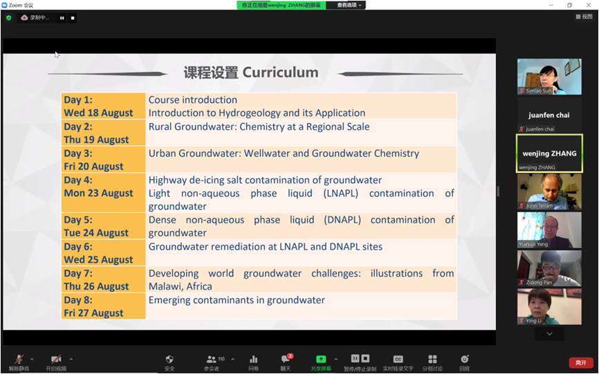 本次課程負(fù)責(zé)人吉林大學(xué)新能源與環(huán)境學(xué)院院長助理張文靜教授、伯明翰大學(xué)地理地球和環(huán)境科學(xué)學(xué)院水文地質(zhì)學(xué)科帶頭人 John Tellam教授,中英雙方團(tuán)隊(duì)的楊悅鎖教授、Michael Riley教授、Simiao Sun博士,以及學(xué)院負(fù)責(zé)研究生培養(yǎng)和國際交流的李瑩老師、楊珵老師于2021年8月18日參加了開班儀式。本次線上課程是繼前期中英學(xué)術(shù)坊等學(xué)術(shù)交流之后的持續(xù)性學(xué)術(shù)交流,雙方相信在日后也能保持緊密的長期合作交流,希望吉大學(xué)子在地下水污染挑戰(zhàn)及修復(fù)課上能夠知惑解惑。