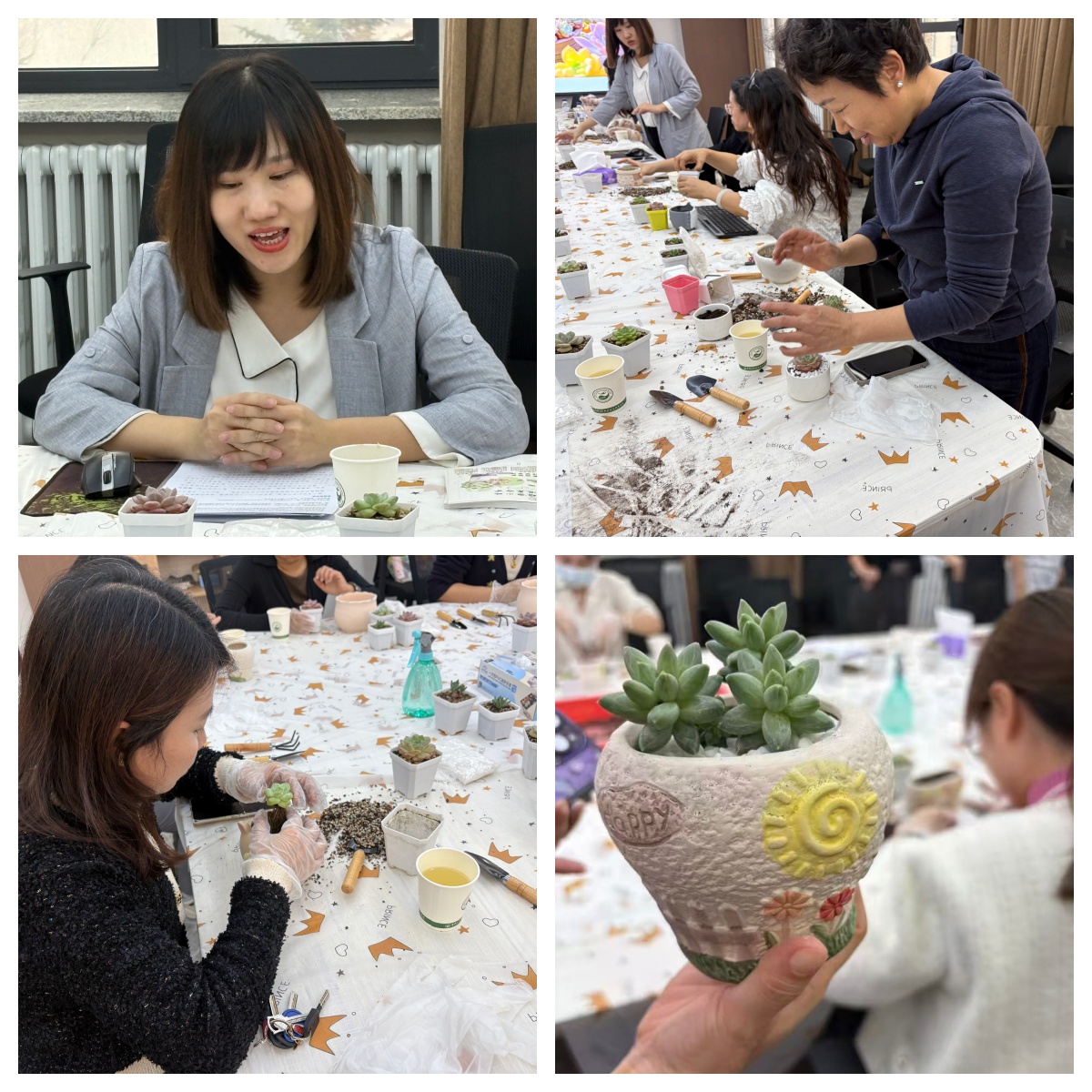 在多肉植物種植環(huán)節(jié),學(xué)院提前準(zhǔn)備了花土、陶粒、白石子及各類園藝工具。蘭嵐老師現(xiàn)場示范種植技巧,教職工們親手栽種屬于自己的多肉盆栽。活動現(xiàn)場歡聲笑語,一盆盆生機勃勃的多肉植物在老師們手中煥發(fā)出活力。