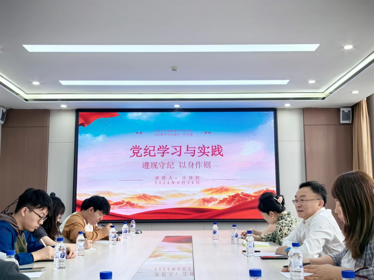 6月24日,學(xué)院黨委書(shū)記汪祥松以“黨紀(jì)學(xué)習(xí)與實(shí)踐”為主題、以“遵規(guī)守紀(jì),以身作則”為切入點(diǎn),為2024屆畢業(yè)生黨員講授畢業(yè)前最后一堂黨課。各教工和學(xué)生黨支部書(shū)記也相繼講授專(zhuān)題黨課,進(jìn)一步加強(qiáng)黨支部政治建設(shè)和紀(jì)律建設(shè),嚴(yán)明黨的政治紀(jì)律和政治規(guī)矩,教育引導(dǎo)師生黨員學(xué)紀(jì)知紀(jì)明紀(jì)守紀(jì)。